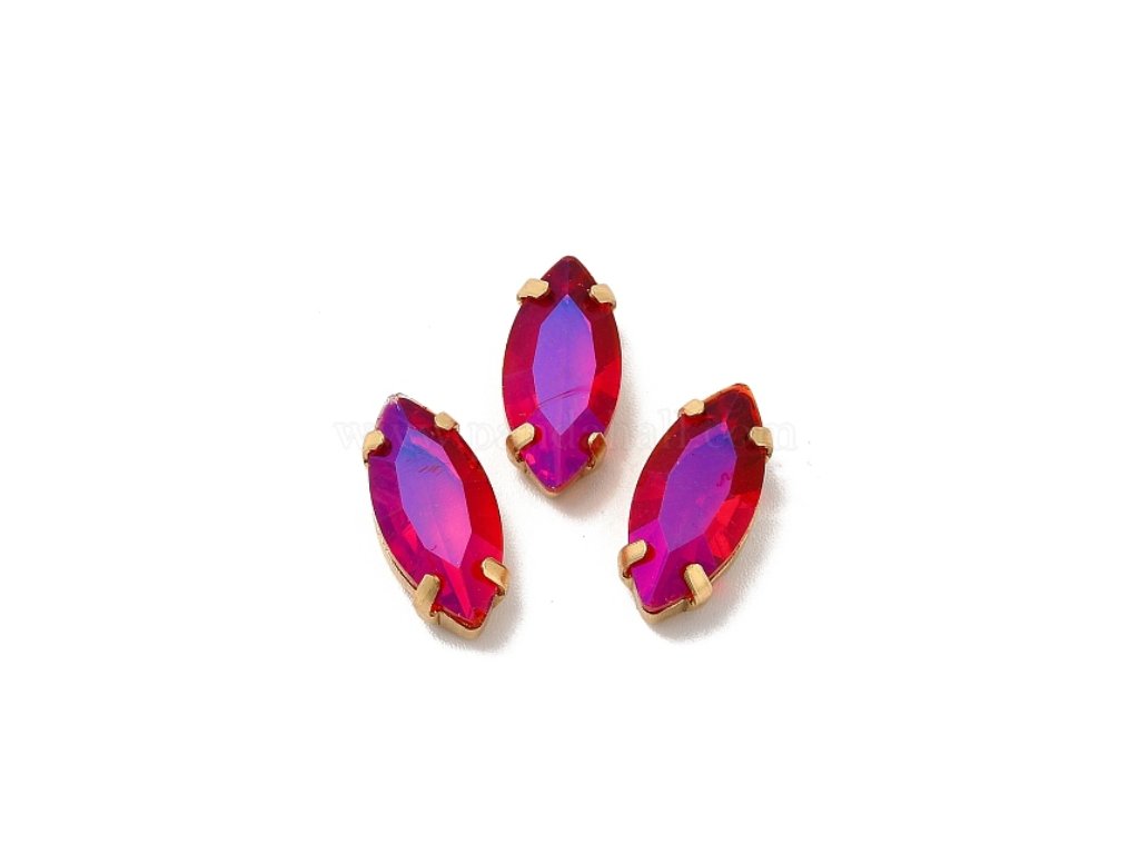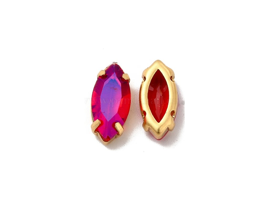 Našívací kamínek s efektem měsíčního svitu, tvar "koňské oko", kotlík je mosazný hroty s otvory pro přišití, barva Siam - sytě červená se světlemodrými odlesky, velikost 15x7x4,5 mm, otvory 1 mm