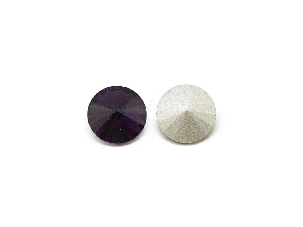 Rivoli - skleněný kamínek broušený do špičky, barva tmavě fialová , průměr 14 mm